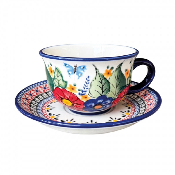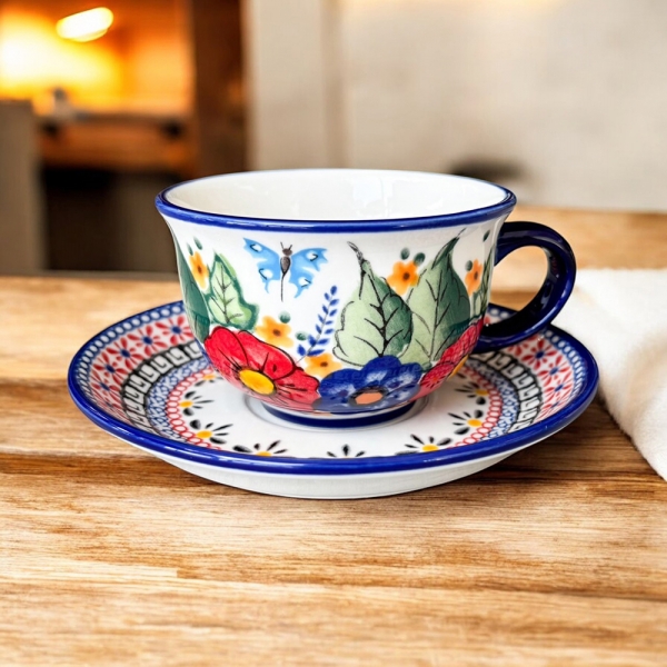 波蘭風手繪藝術陶瓷咖啡杯碟-花蝴蝶